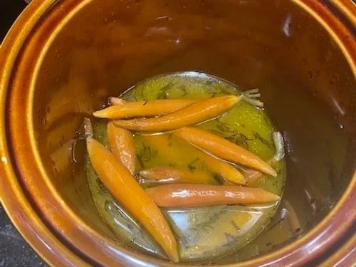 All you need is carrots, water, left over white wine, 1 stick of butter, fresh or dried garlic and rosemary, salt and pepper- and a slow cooker. To make the recipe, dump all of the ingredients into a slow cooker and set it on low to medium heat for at least 4 hours.
