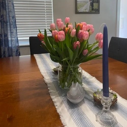 Candles are a must have for any dinner table. I have an assortment of low and high candlesticks, and a set of glass hurricanes that I love using for an outdoor table setting. The hurricane is perfect for making sure the wind doesn’t blow out your candles. I also have an assortment of candles and candlesticks to go with all the candlesticks. I visited the Old Candle Barn in Lancaster, PA years ago and bought taper candles in all the prettiest fall colors. Since I primarily use them for decoration, I still have many of them and swap them out with the seasons. I also have white and black tea, votive and taper candles which can be used year-round. Battery-powered candles are a great option if you don’t want or can’t have an open flame.