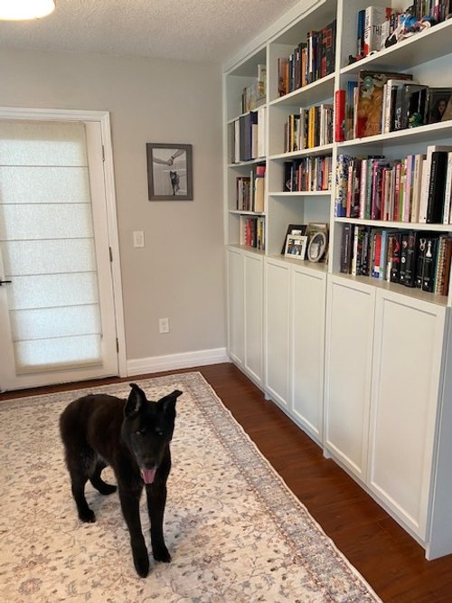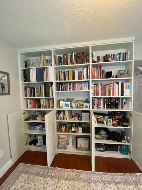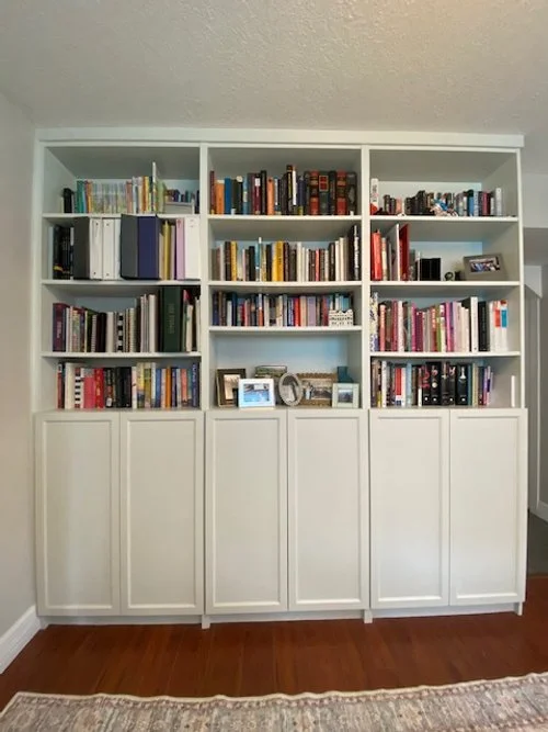 Now that your paint is dry and doors are up, you can get to unpacking your books. This is the absolute best part- getting all your books on the shelves and seeing your hard work for the bookshelf wall pay off.