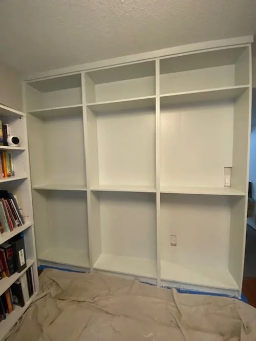 Using the measurements for our space, I went to the Ikea website to pick out the exact cabinets and configuration for what I wanted. I wanted open bookshelves on top and closed storage on the bottom. I originally thought I would use the Ikea PAX cabinets that are popular for similar projects. Due to the size of our space, the Billy was a better fit. We ended up using the Billy bookcases, Billy height extension units, and Oxberg doors to close the bottom half. A full list of our materials is below.