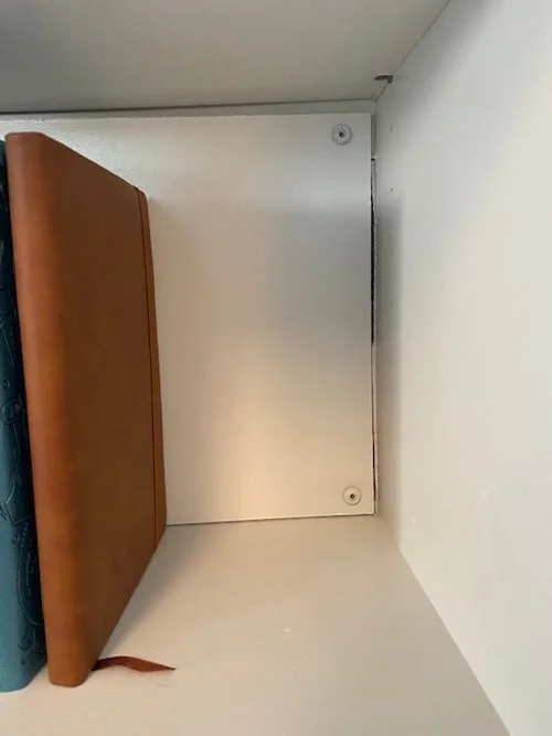 Instead of moving or losing our light switch, we loosely installed the backer board over our Amazon Alexa flip light switch. Alex expertly measured the location of the light switch and cut out that area from the back board of the bookshelf. Using small white cabinet screws, he then re-attached the cut piece of particle board over the light switch. This should loosely cover the light switch. Using the Alexa light, we don’t have to use the switch to turn the lights on or off. But if needed, you can still turn the light on or off by pushing the board.
